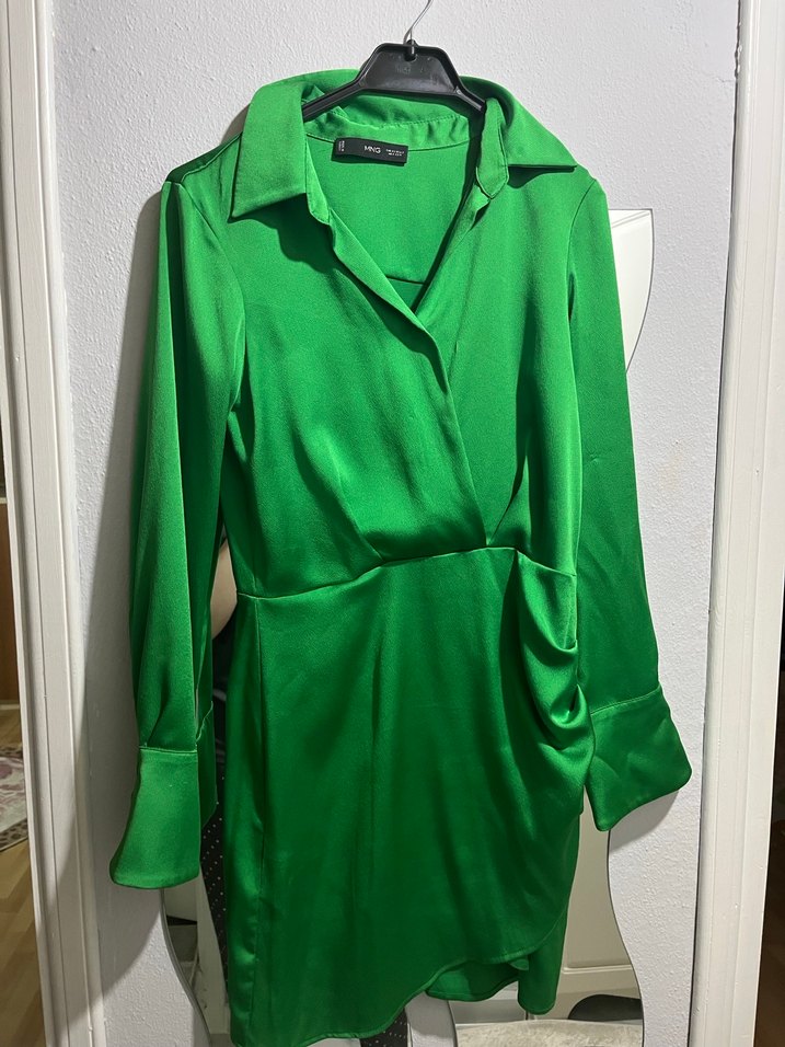 Yeşil renkli, V yakalı ve uzun kollu midi elbise. Drapeli detaylı, parlak yüzeyli ve vücuda oturan kesimle ofis için uygun. Saten kumaş