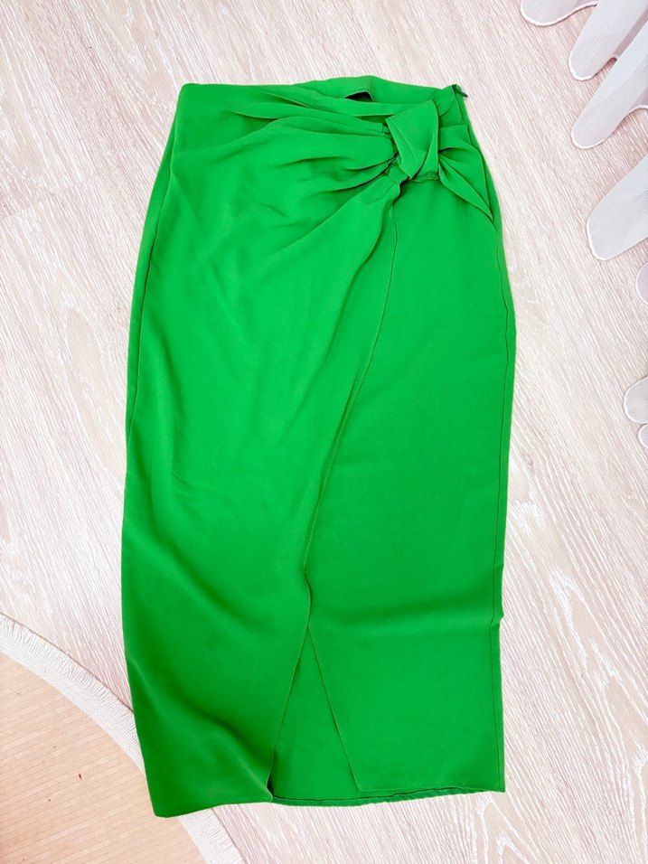 Yeşil renkte, drapeli detaylara sahip, vücuda oturan midi uzunlukta kadın eteği. Düz ve minimalist tasarımı ile ofis için uygundur. Marka temsilidir