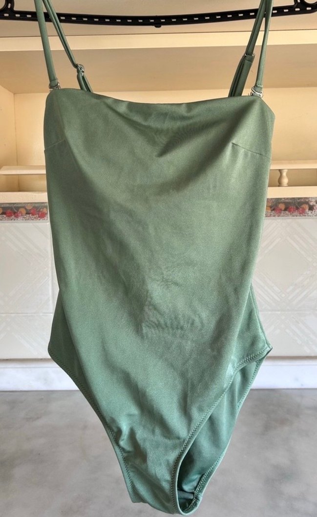 Bu koyu yeşil kadın mayo, drapeli yakası ve vücuda oturan, kolsuz midi kesimiyle minimalist ve bohem stile uygundur.