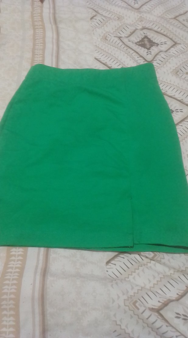 Yeşil renkte, drapeli tasarıma sahip midi mini etek. Sentetik kumaştan, parlak görünümlü ve normal kalıplı, günlük kullanıma uygun.