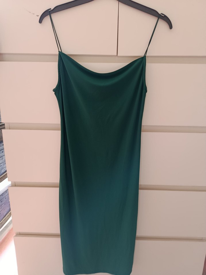 Yeşil renkte, drapeli ve straplez yakalı, saten dokulu, midi boyda, vücuda oturan ve kolsuz elbise. Romantik buluşmalar için uygundur.