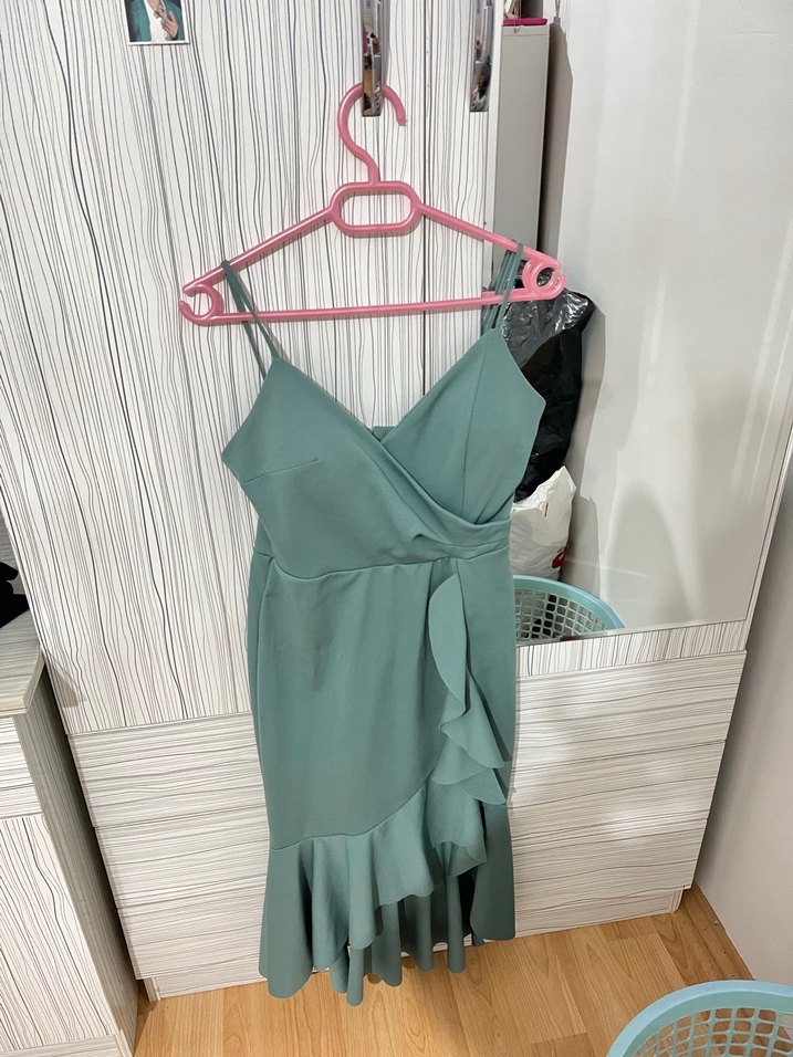 Pastel yeşil, straplez yakalı, drapeli detaylara sahip, vücuda oturan midi abiye elbise, partiler için uygun.