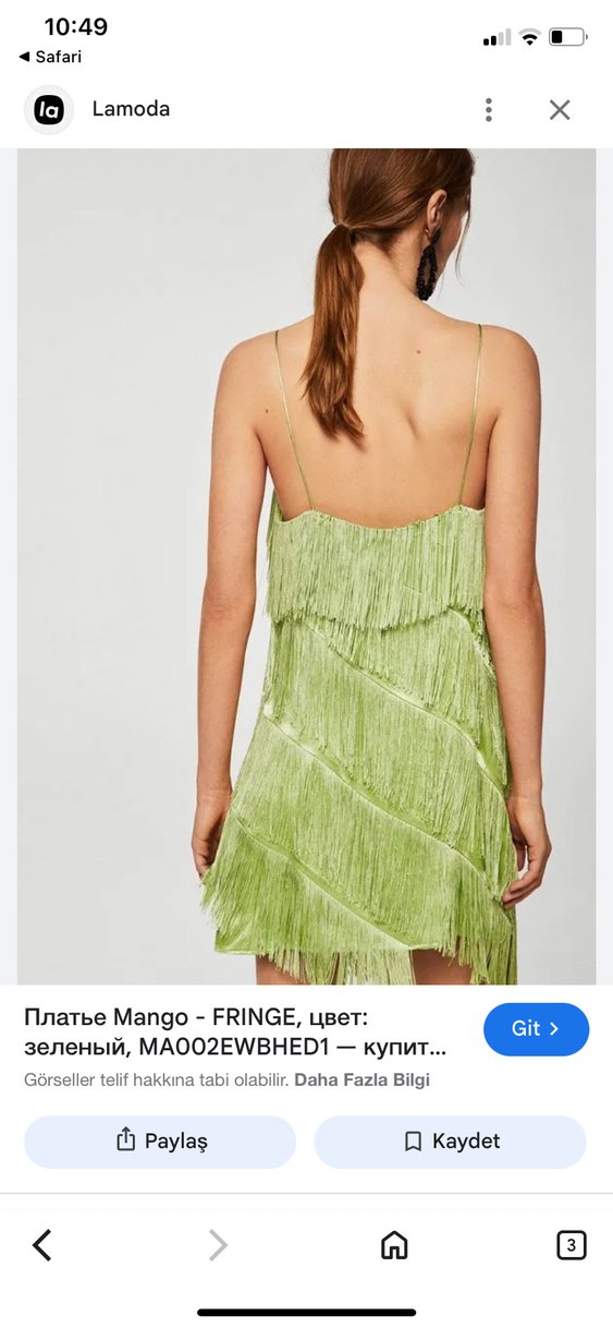Mangonu püsküllü serisinden… Parlak yeşil tie-dye desenli, V yakalı ve drapeli katmanlara sahip, askılı kısa elbise. Parti ve davetler için uygun. Kusursuzdur ip askılarını isterseniz içeri doğru kısaltırabiliyorsunuz.