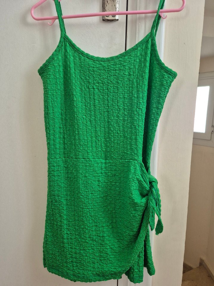 Yeşil renkte, dokulu keten kumaştan yapılmış, askılı ve drapeli detaylı, dar kesim mini Tulum. Rahat ve bohem tarzda, günlük kullanıma uygundur.