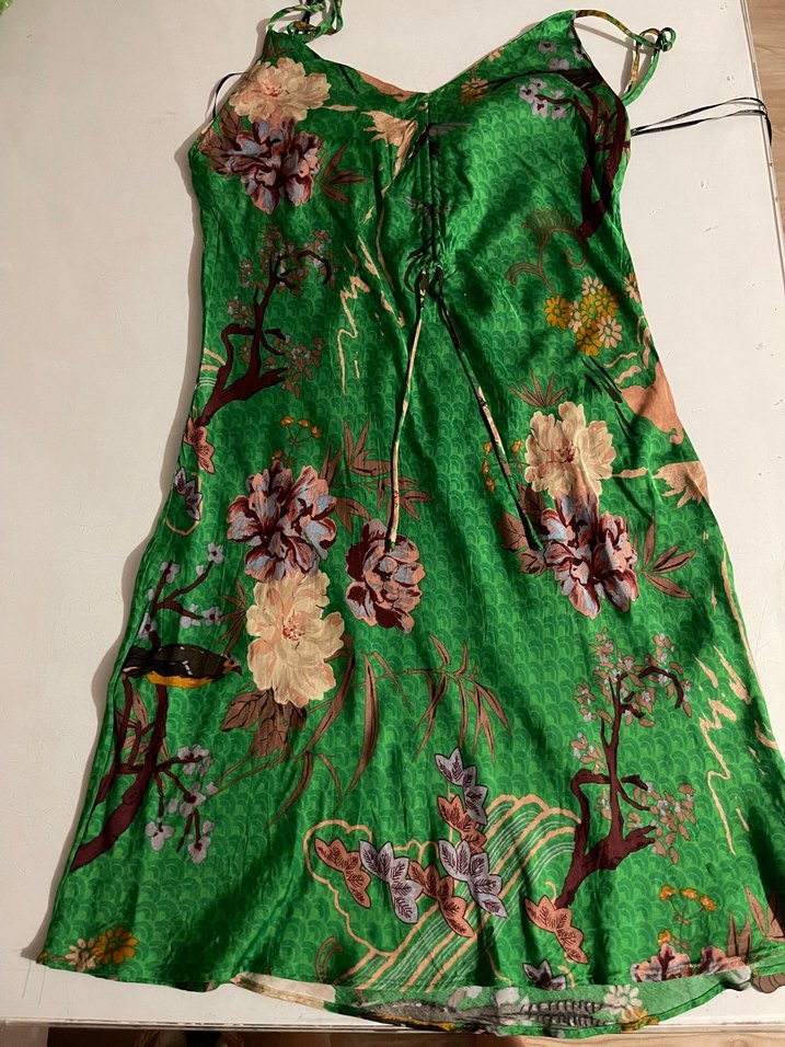 Drapeli detaylı, askısız kısa yeşil elbise. İnce kesim, ipeksi kumaş ve tie-dye desen romantik akşamlar için uygundur.