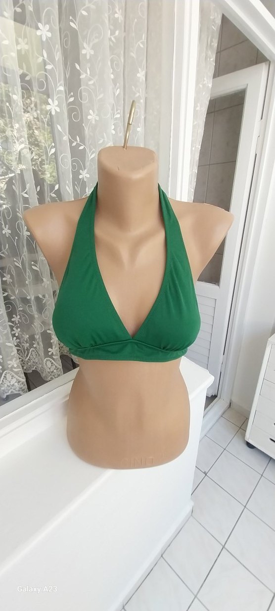 Yeşil, drapeli ve askılı, mini boy, parlak görünümlü, bohem tarzda ve minimalist plaj kullanımı için uygun, vücuda oturan bikini üstü.