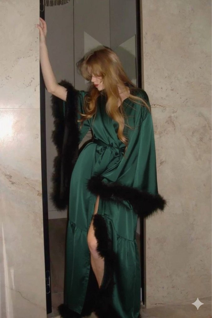 Yeşil Drapeli Saten Tüylü Uzun Kadın Sabahlık
