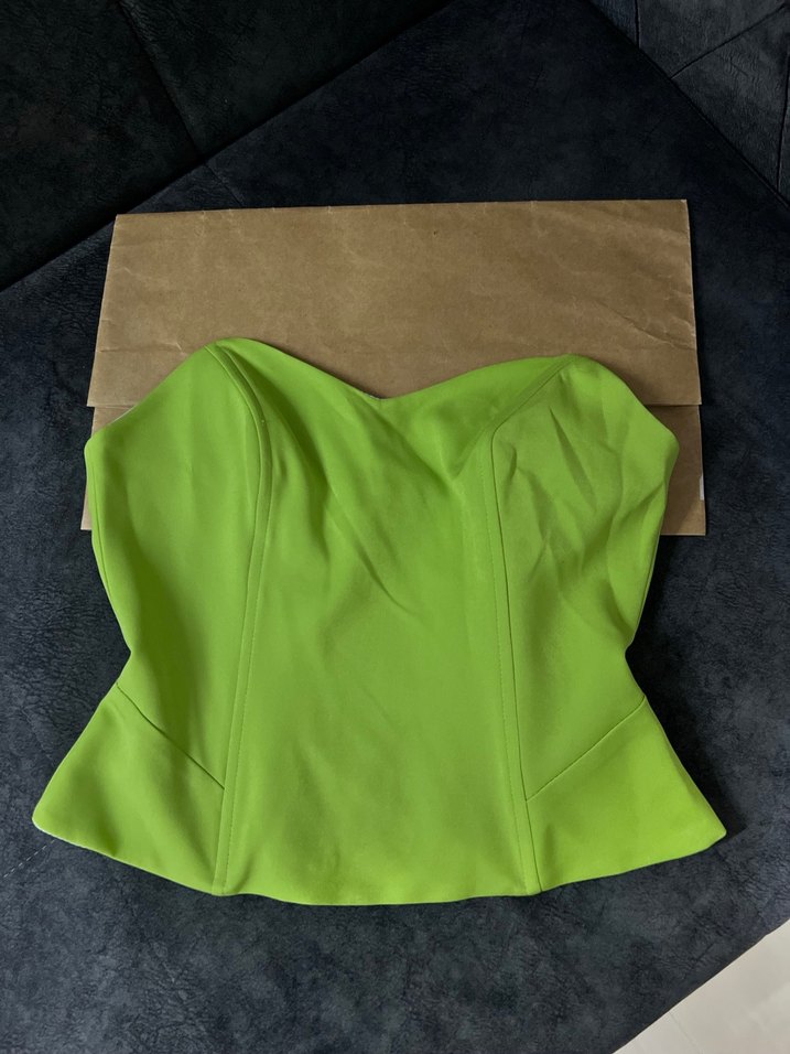Drapeli, yeşil renkli, straplez ve kolsuz olan bu büstiyer, sentetik kumaştan üretilmiştir. Minimalist ve çağdaş tarzıyla dış mekan kullanımı için uygundur.