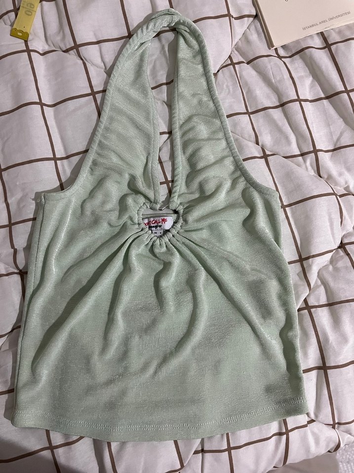 Yeşil renk, straplez yaka ve drapeli detaylara sahip, nakışlı ve parlak sentetik kumaştan yapılmış, vücuda oturan kadın atlet.