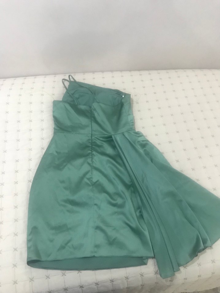 Yeşil parlak kumaştan, drapeli ve straplez tasarıma sahip, vücuda oturan midi boy abiye elbise. Düğünler için çağdaş ve şık bir tercih.