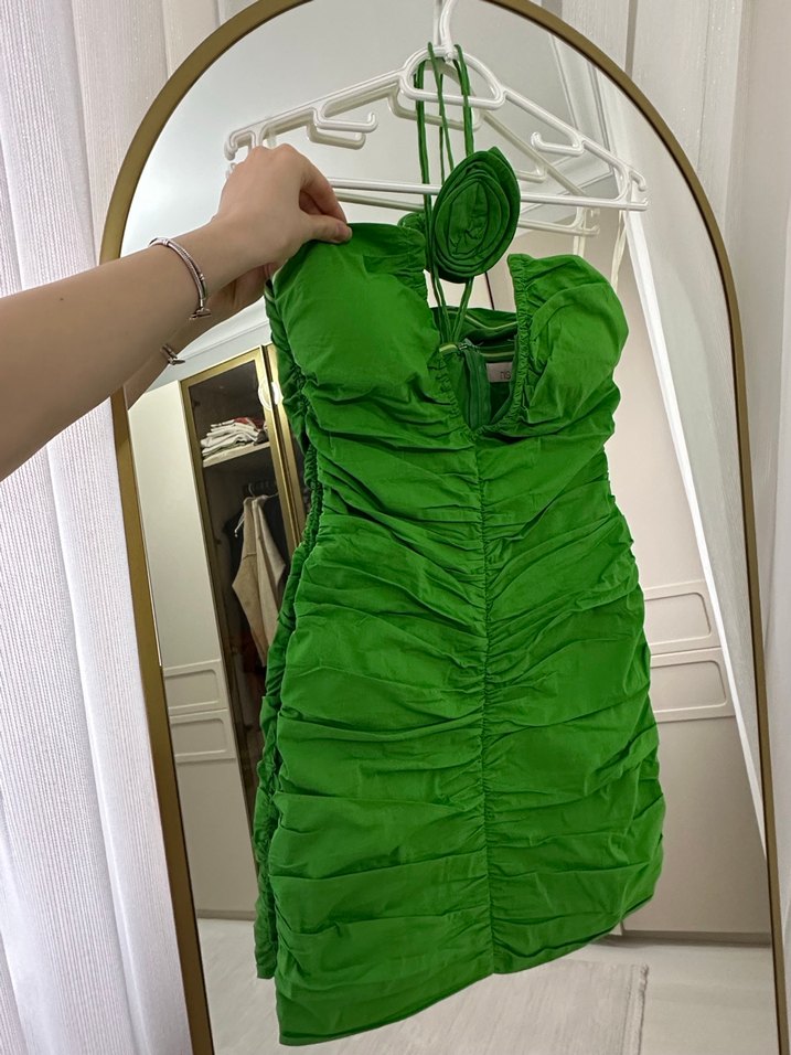Yeşil, straplez, drapeli ve askılı kollara sahip dar kesim mini elbise. Parlak dokusu ve baskılı deseniyle parti için uygun.
