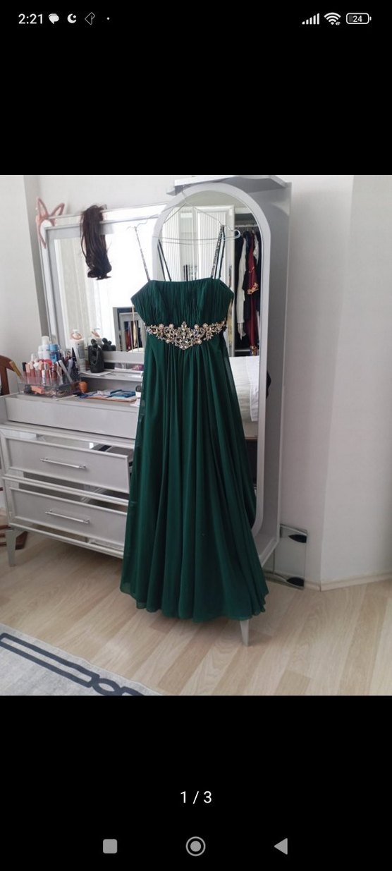 Koyu yeşil uzun abiye elbise, straplez yaka ve ince askılarla. Drapeli detaylar ve baskılı deseniyle, düğünler için uygun.