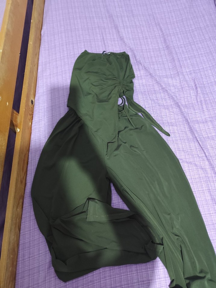 Yeşil sentetik kumaştan, drapeli ve balıkçı yaka tasarımlı, ince kesim uzun hamile tulumu. Askılı kollu ve sokak stiliyle dış mekan için uygundur.