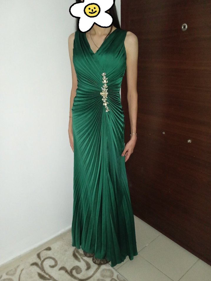 Parlak yeşil renkte, V yaka ve kolsuz drapeli uzun abiye elbise. Elbisenin uzunluğu 1.60cm 1.75 boyda ve 60 kilo giydim.hafif yerde sürünüyordu. 3 taşı düştü onun dışında hiçbir sorunu yok. ona gore fiyat belirledim.