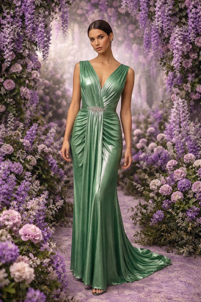 Kolsuz, v yaka ve drapeli detaylarıyla yeşil, parlak desenli uzun abiye elbise. Düğünler için şık ve çağdaş bir tasarım.