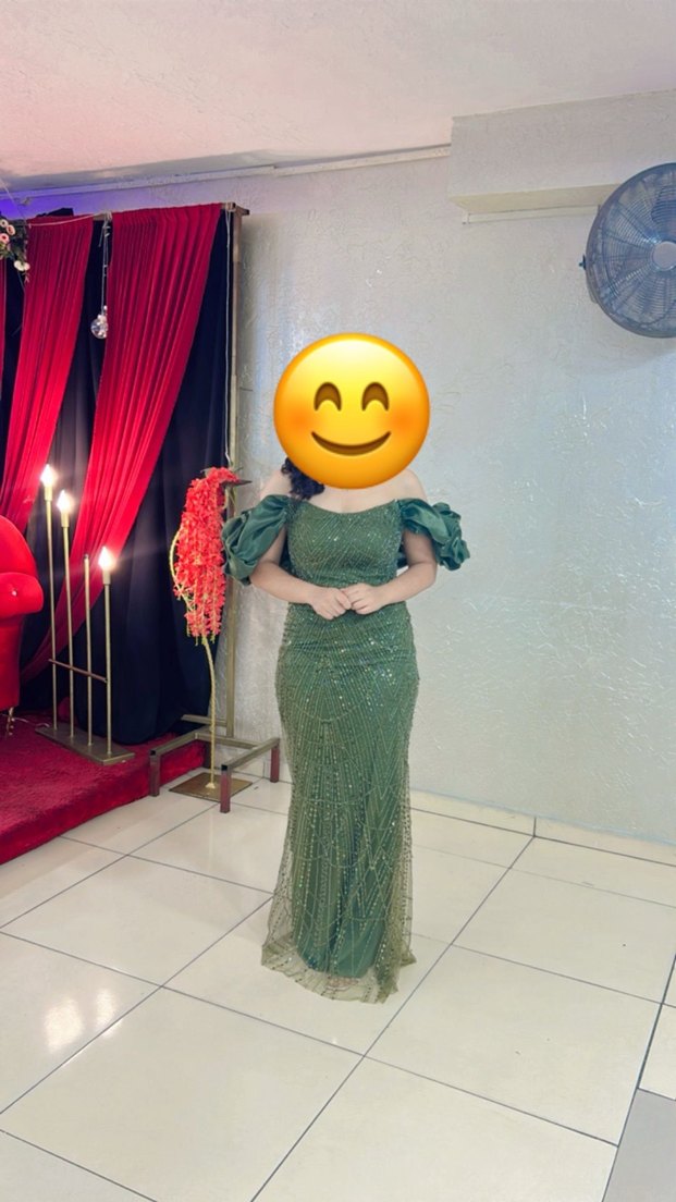 Yeşil, drapeli ve straplez yaka detaylı, uzun ve vücuda oturan bu nişan elbisesi, göz alıcı bohem tarzıyla dikkat çekiyor. 38 bedene uyumlu kalıbı dar yeni aldım 2 saat giydim