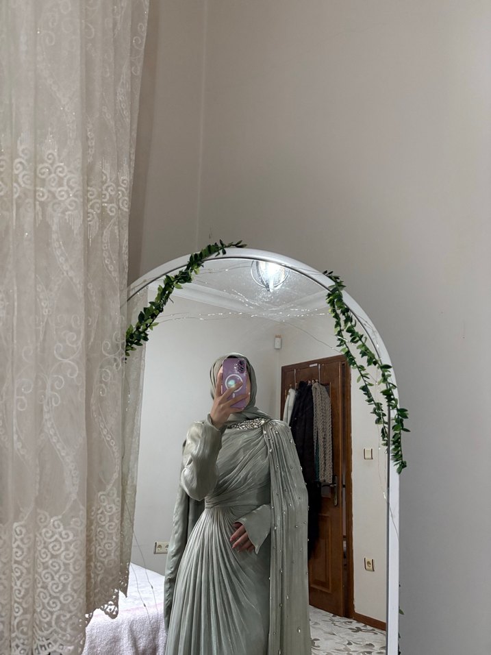 Yüksek yakalı, uzun kollu ve bol kesimli yeşil uzun abiye elbise, drapeli tasarımıyla modest ve avangart tarzda düğünler için uygun. şal için 100 tl fiyat konulmuştur bilginize
