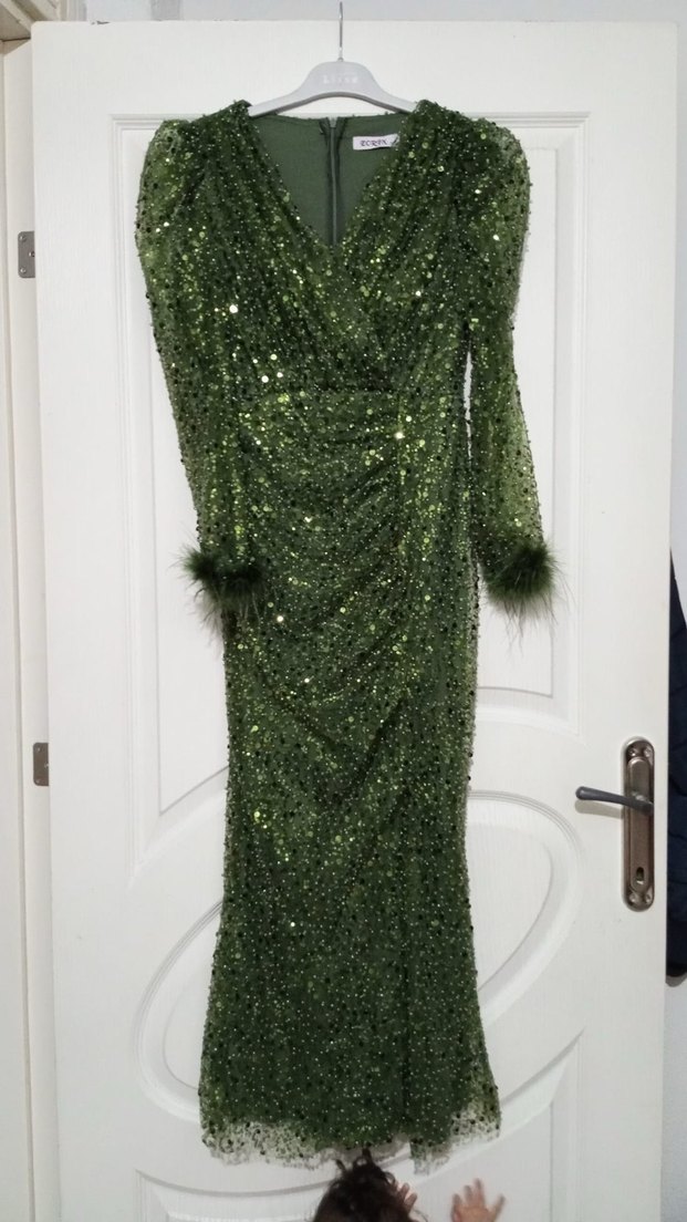 Bu yeşil drapeli uzun abiye elbise, fitted kesim, yılan desenli ve uzun kollu, kürk detaylı manşetlere sahip, gösterişli partiler için ideal. Sadece bir kez giyildi BEDEN 38 YAZIYOR AMA 34/36 uyumlu 145 cm boy 46 kilo da 10 cm topuklu ile giyildi detaylı foto isterseniz atarım