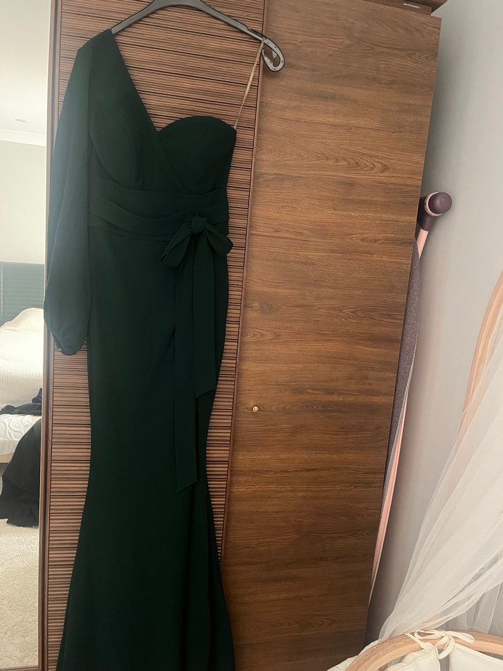 Yeşil uzun abiye elbise, drapeli ve v yaka detaylıdır. Tek kol, yırtmaçlı, klasik ve modern tarzda, düğünler için uygundur. Orjinal markadır.