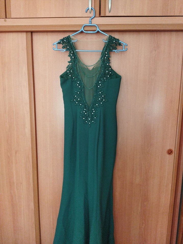Bu yeşil, drapeli ve parlak detaylı uzun abiye elbise, derin V yakalı ve kolsuzdur. Klasik zarafet ve bohem tarzını birleştirir, düğünler için uygundur.