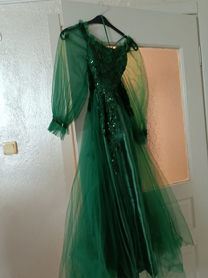 Drapeli ve desenli detaylara sahip, uzun kollu, straplez, bol kesim koyu yeşil abiye elbise. Düğün ve avangart tarz için uygun.