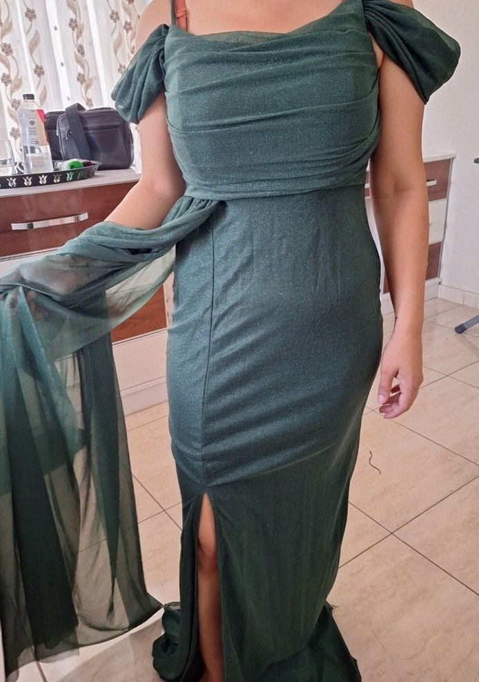 Yeşil renkte, drapeli ve uzun boylu, straplez ve vücuda oturan abiye elbise. Yanında yırtmaç ve modern klasik tarzda, düğün için uygun.