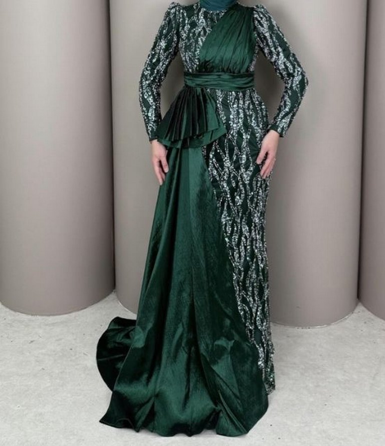 Yeşil drapeli uzun abiye elbise, uzun kollu, yüksek yakalı ve desenli tasarıma sahip. Düğünler için uygun, normal kesim.