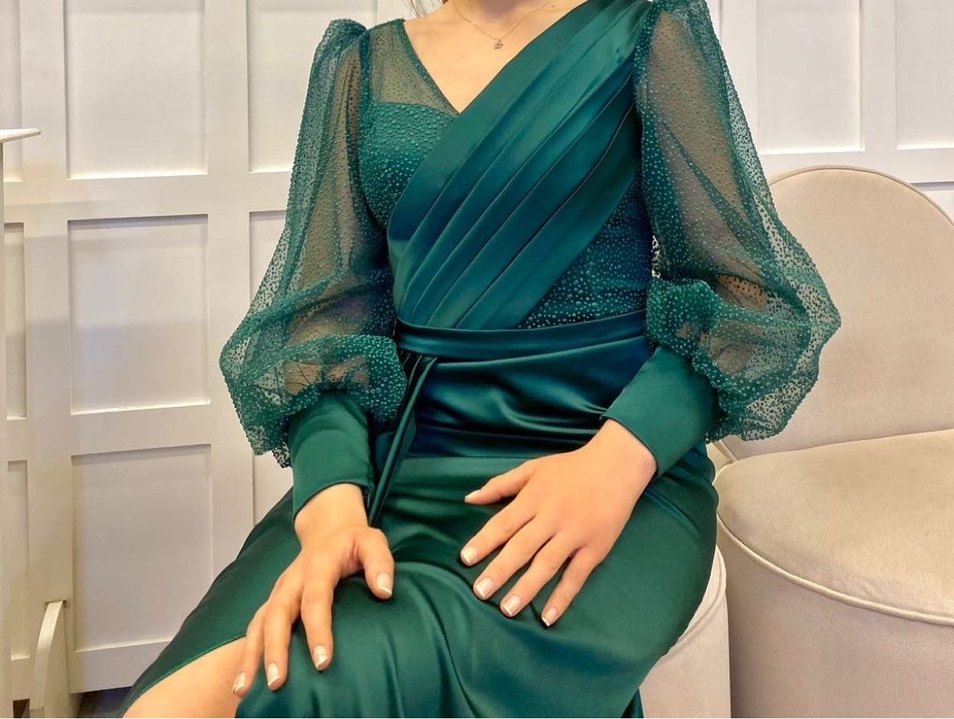 Drapeli ve V yakalı, uzun ve dar kesim yeşil abiye elbise. İnce işlemeli ve şeffaf askılı kollarla düğünler için uygundur. Bir kere nişanımda kullandım 38 36 beden e uygun ciddi alıcılar için ölçü verebilirim.