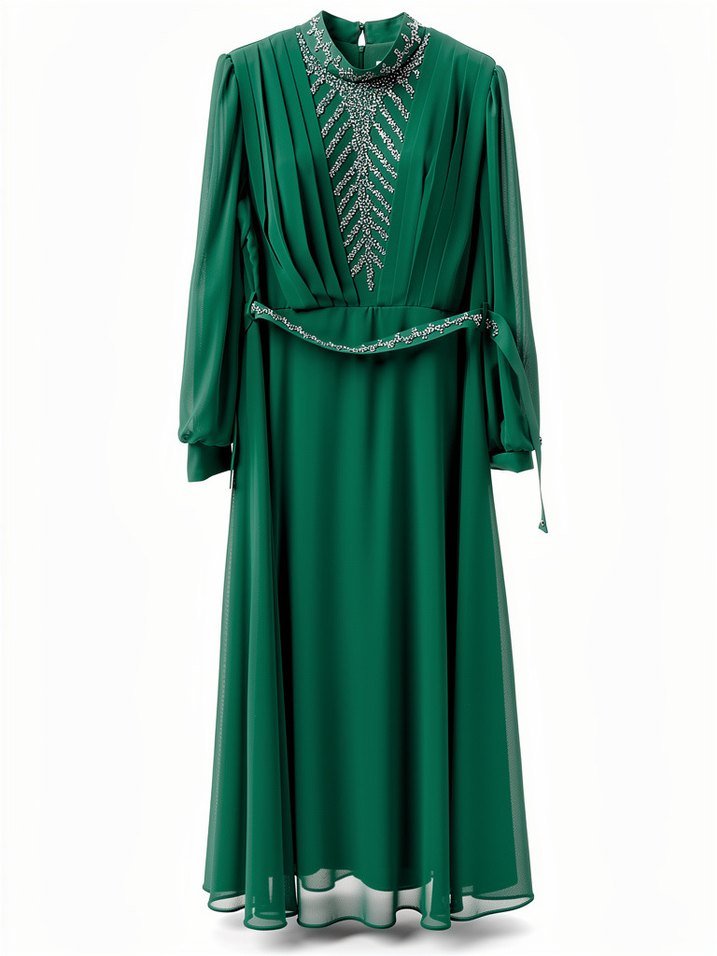 Uzun yeşil abiye elbise, drapeli detaylar, yüksek yaka ve nakışlı desenlere sahiptir. Salaş kesim ve uzun kolludur, düğünler için uygundur. ✨