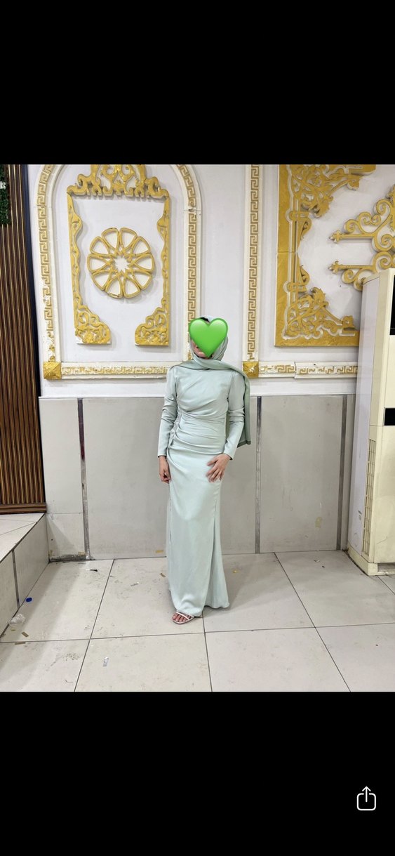 Bu yeşil drapeli uzun abiye elbise, yüksek yaka ve uzun kollu yapısıyla modern ve sade bir şıklık sunar. Düğünler için uygundur.