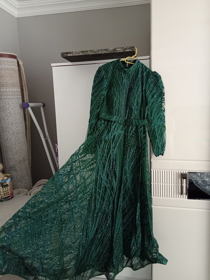 Yeşil renkte, yüksek yakalı ve drapeli tasarıma sahip uzun, dar kesim abiye elbise. İnce askılı kolları ve desensiz dokusu ile bohem, avangart bir stil sunar. 1 defa kullanılmıştır.