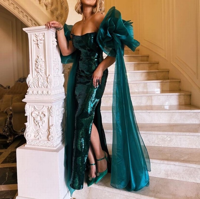 Drapeli, straplez ve oturan kesim uzun abiye elbise, koyu zümrüt renkte nakış detaylara sahip, göz alıcı ve şık.