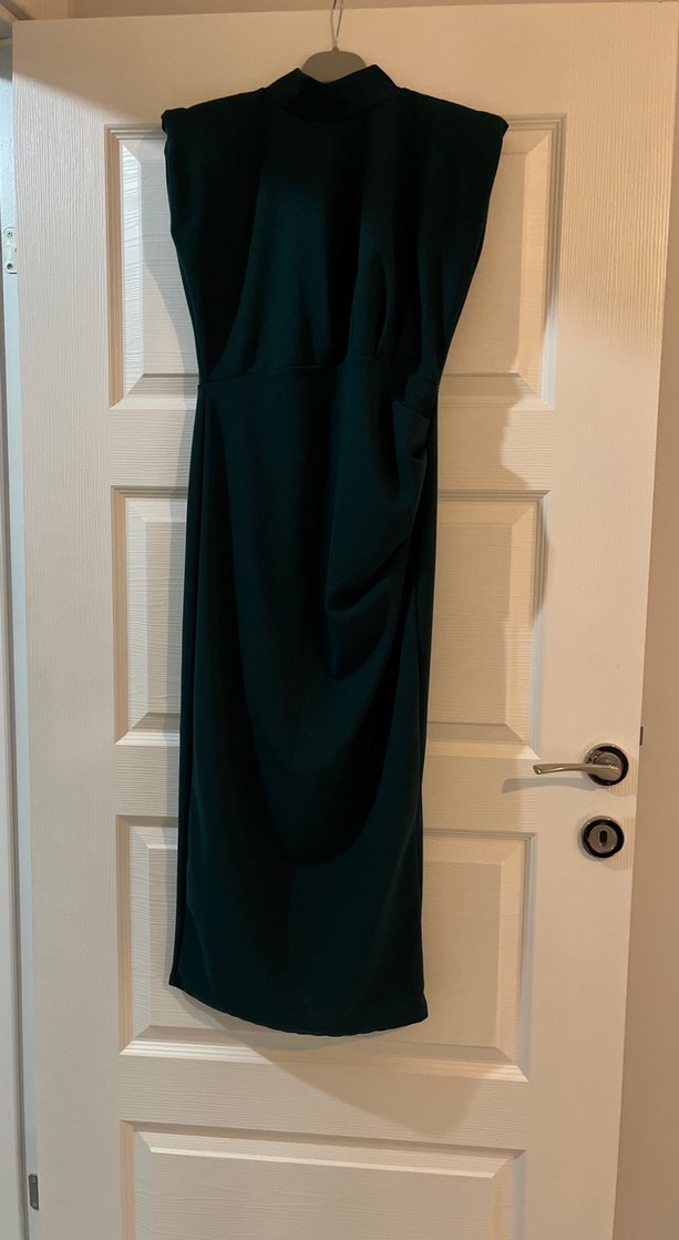 Yeşil, drapeli, uzun ve vücuda oturan bu abiye elbise, yakalı ve kolsuzdur. Ofis ortamı için uygundur ve minimalist, çağdaş tarza sahiptir.