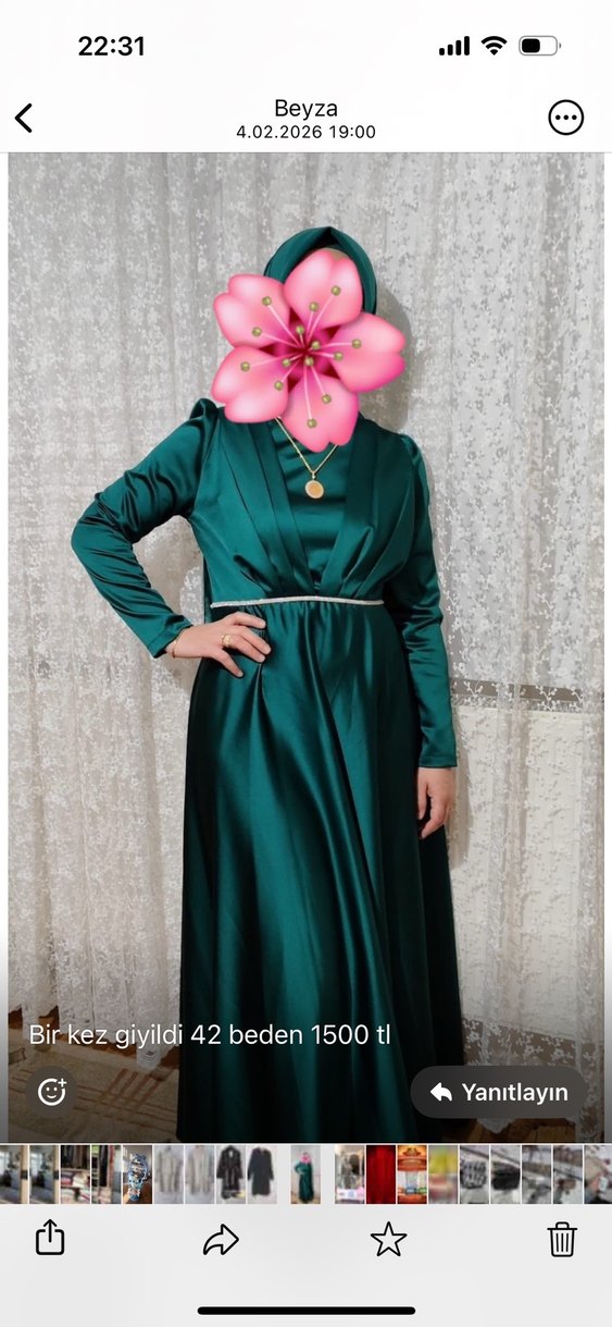 Drapeli ve uzun kollu, yüksek yakalı yeşil renkli, modern klasik tarzda, 42 beden uzun abiye elbise.