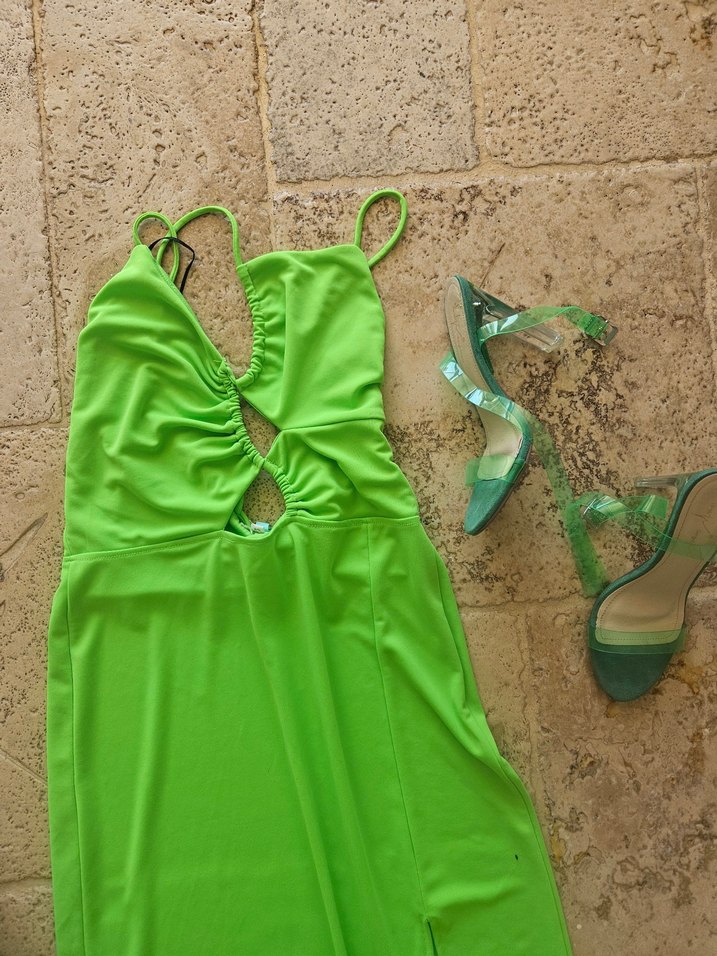 Parlak yeşil sentetik kumaştan, drapeli detaylı, V yakalı, fitted kesim uzun elbise. Parti için şık ve gösterişli.