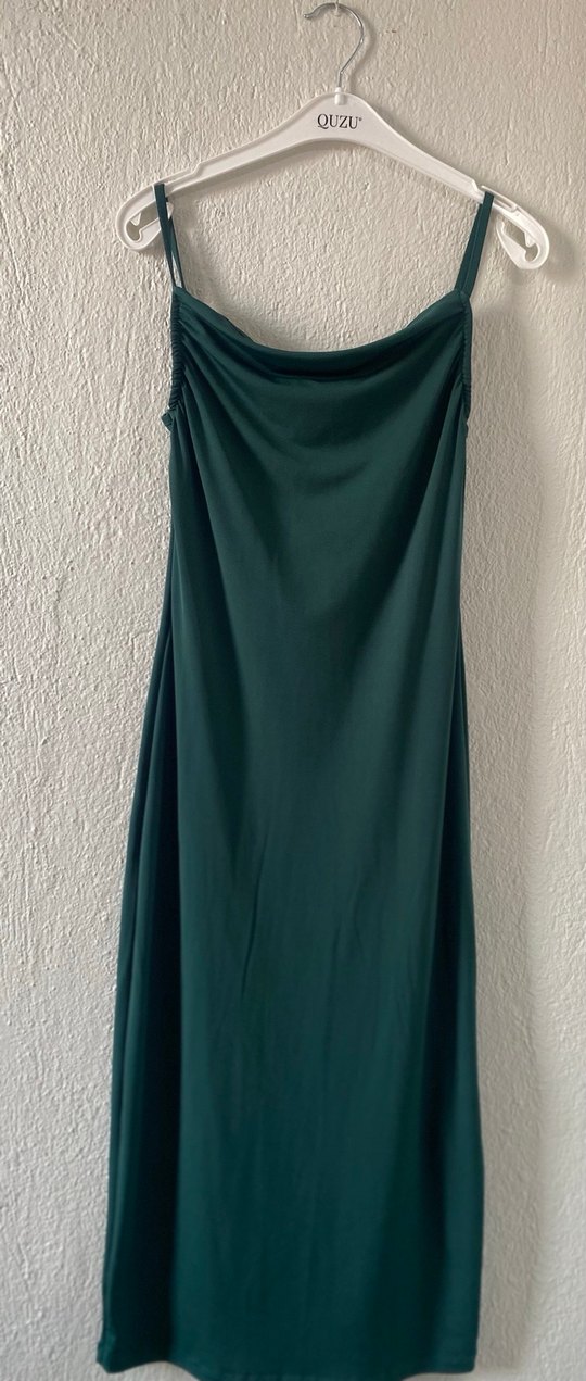 Drapeli, askısız yaka ve vücuda oturan kesimiyle koyu yeşil uzun elbise. Yumuşak sentetik kumaştan, romantik akşamlar için ideal. Az giyilmiştir.