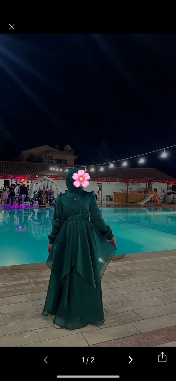 Koyu yeşil renkte, drapeli tasarıma sahip uzun abiye elbise. Yüksek yaka, çiçek desenli ve askılı kolludur. Salaş kesim, bohem ve mütevazı tarzı yansıtır.