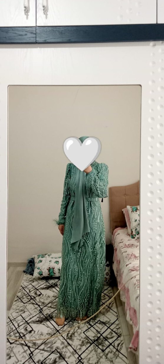 Açık yeşil, drapeli ve uzun kollu bu bohem elbise, yüksek yakası ve vücuda oturan kesimiyle düğünler için uygun, sade ve şık bir tercihtir.