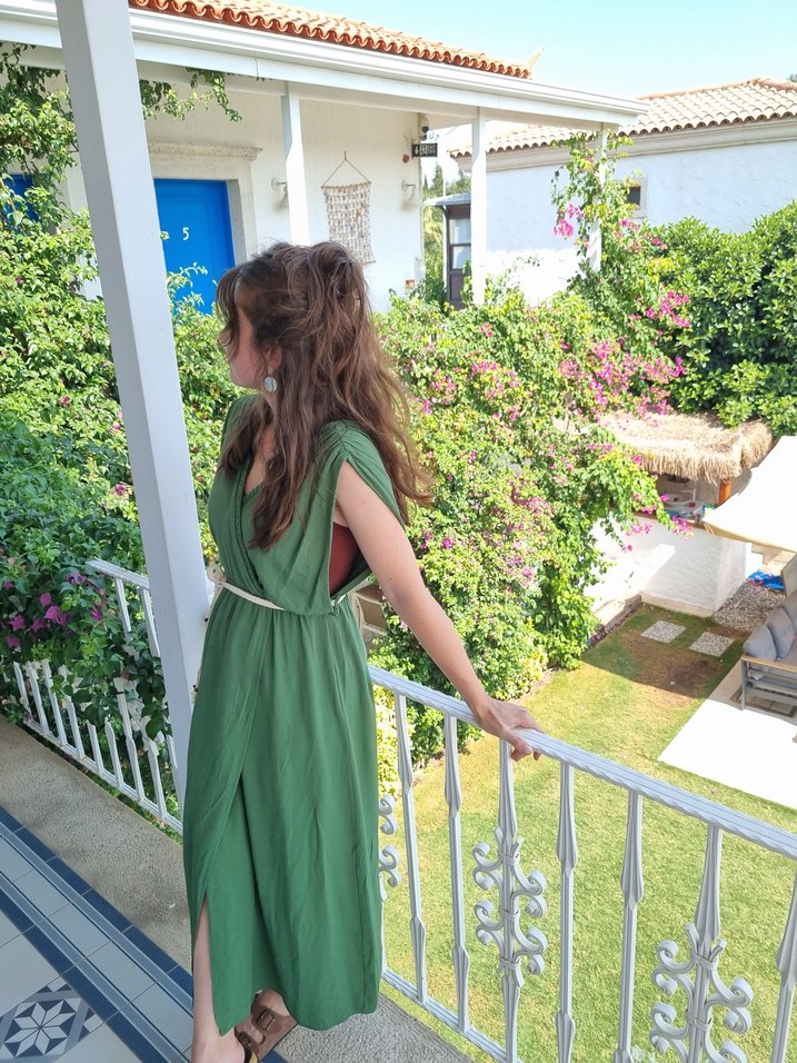 Yeşil, şile bezi gibi bir kumaştan, uzun bohem elbisedir. Krem örgü kemerli