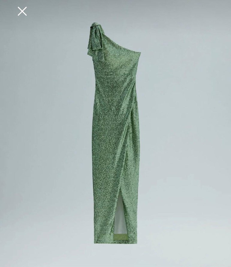 Bu yeşil uzun elbise, drapeli tasarımı ve tek askılı straplez yakası ile dikkat çeker. Parlak sentetik kumaştan üretilmiş olup, çağdaş ve yılan desenli şık bir tarza sahiptir.