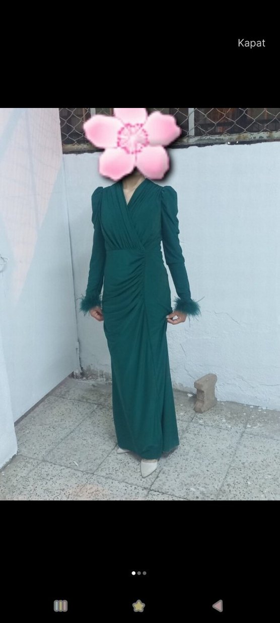 Bu koyu yeşil uzun abiye elbise, V yaka ve uzun kollu, drapeli detayları ve tüylü manşetleriyle modern klasik tarzda. Drapeli ve V yakalı, uzun kollu yeşil abiye elbise, klasik şıklığı modern dokunuşla birleştirir. XS BEDEN. Beden küçültüldü.Yeni gibi. Astarlı ince kadife ligralı abiye. XS beden. Beden daraltıldı.