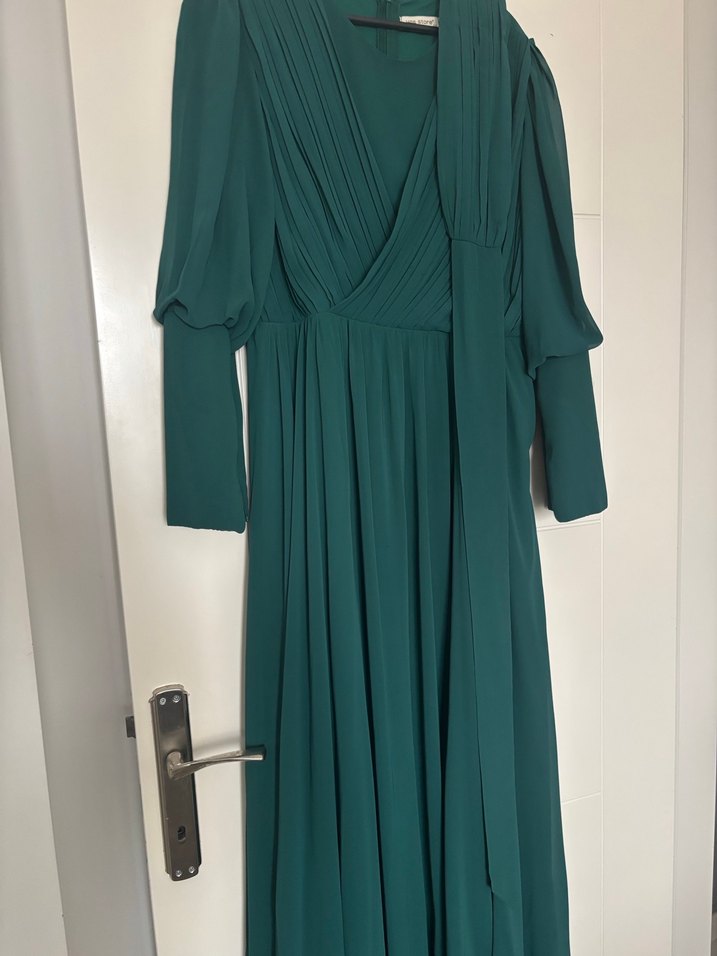 Koyu yeşil renkte, V yakalı ve askılı kollu, drapeli uzun elbise. Yumuşak şifon , bol kesim ve minimalist modern klasik tarzda, düğün için uygun.