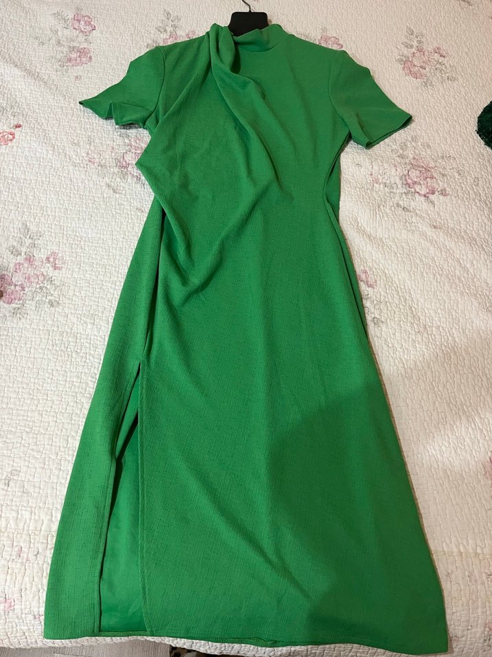 Yumuşak sentetik kumaştan, yüksek yakalı, kısa kollu, drapeli detaylı ve yan yırtmaçlı yeşil uzun elbise. Parti için uygun. Hic giyilmedi