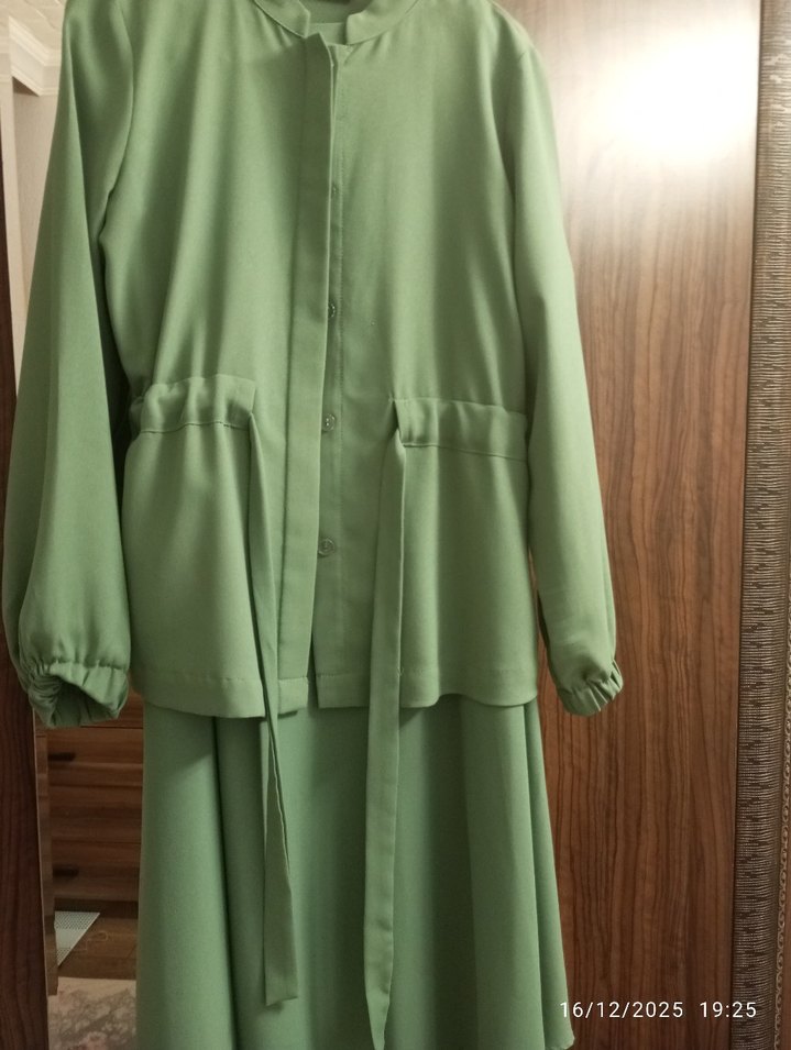 Pastel yeşil renkte, uzun kollu ve yakalı, drapeli detaylara sahip, rahat kesim uzun kadın elbisesi. Ofis kullanımı için uygundur, desen içermez.