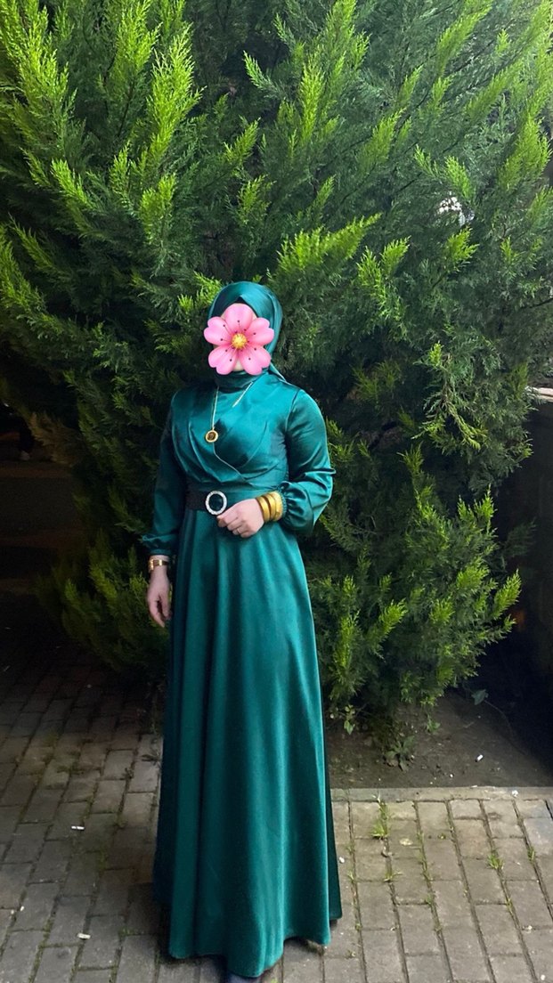 Yüksek yakalı, drapeli ve taş kemerli uzun kollu yeşil abiye elbise
