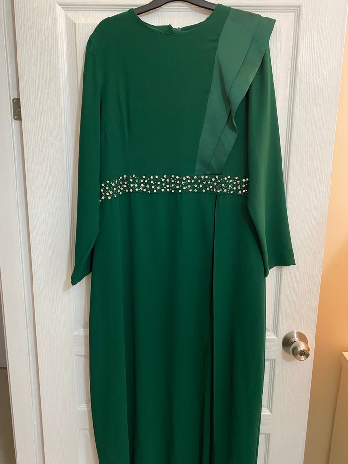 Yeşil renkte, uzun kollu ve yuvarlak yakalı abiye elbise, drapeli detay ve parlak boncuklu bel süslemeleriyle klasik ve modern bir şıklık sunar. İkili takım