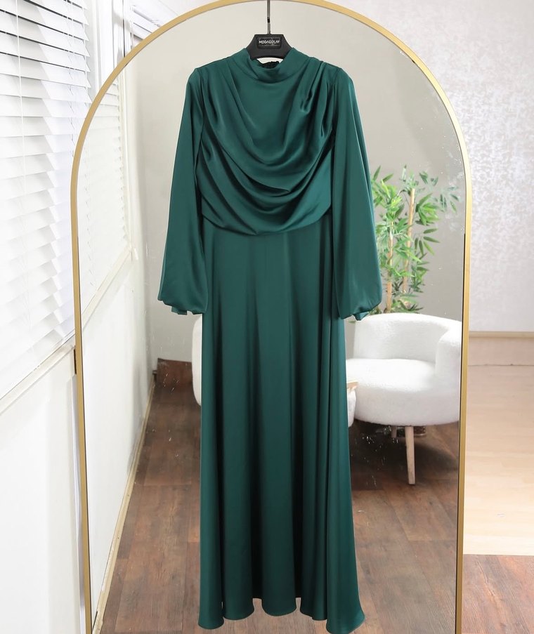 Yeşil renkte, yüksek yakalı ve drapeli detaylı uzun kollu uzun elbise. Salaş kesimiyle modern klasik tarzda, ofis için uygun ve minimal bir görünüme sahip. 40 bedenken giyilmiştir.