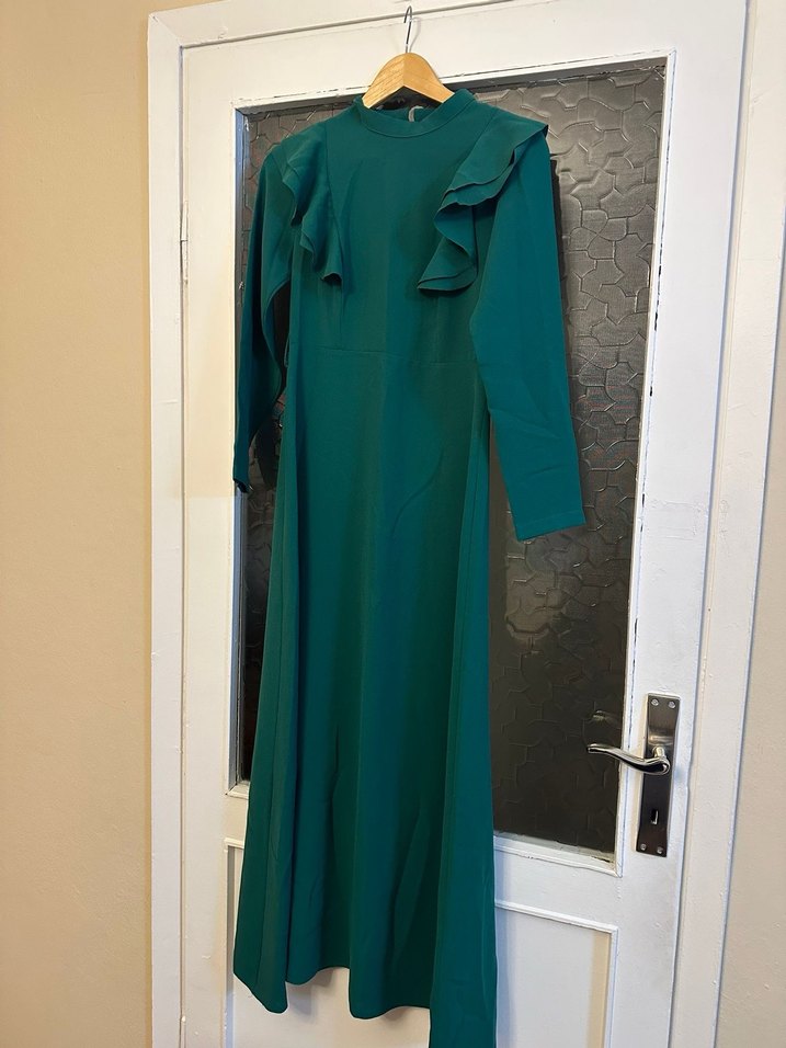 Yeşil Drapeli Uzun Kollu Uzun Elbise