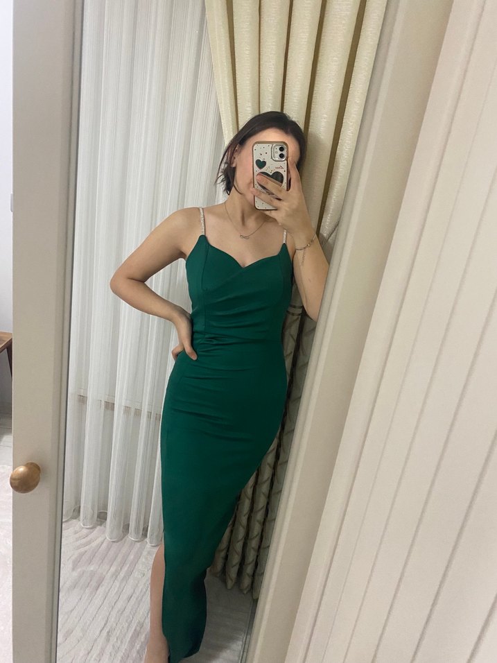 Bu yeşil saten uzun elbise, ince askılı ve drapeli tasarımıyla dikkat çekiyor. Vücuda oturan kesimi ve straplez yaka detayı bulunuyor.