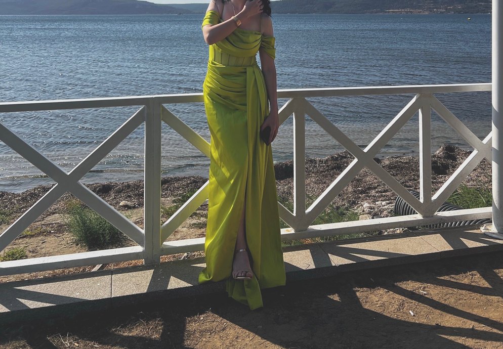 Drapeli detaylara sahip, straplez ve askılı uzun yeşil abiye elbise. Parlak kumaşı ve vücuda oturan kesimiyle düğünler için uygundur.